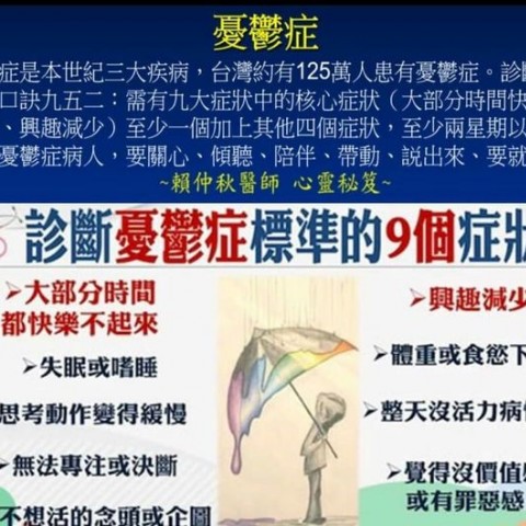 名人、藝人自殺死亡的消息常有所聞,他們通常有一個共同的疾病⋯憂鬱症,有的是沒有接受治療,有的是治療不完整,真正接受適當治療的患者竟然只有十分之一。